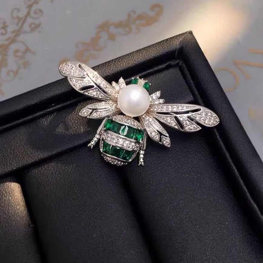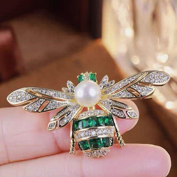 A stunning bee-inspired brooch crafted with shimmering pavé crystals, deep emerald baguettes, and a lustrous pearl centerpiece. Perfect for adding a touch of luxury and charm to blazers, dresses, or scarves.