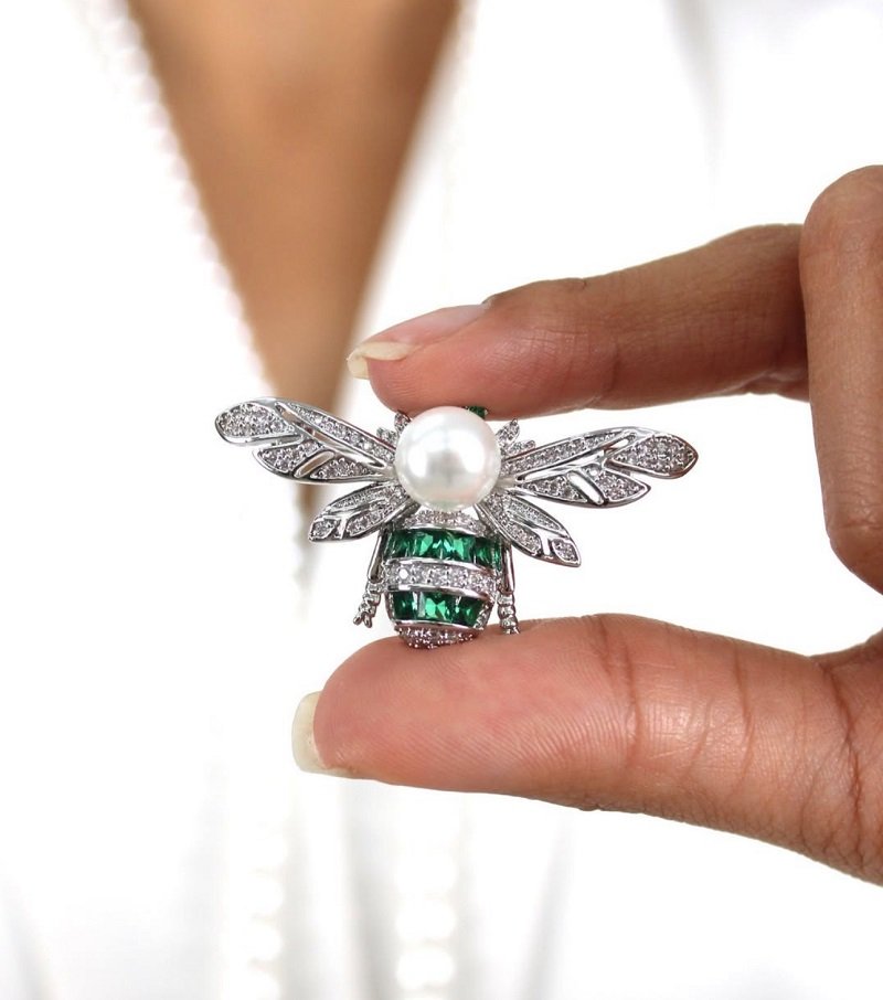 Emerald Diamond Pearl Bee Brooch