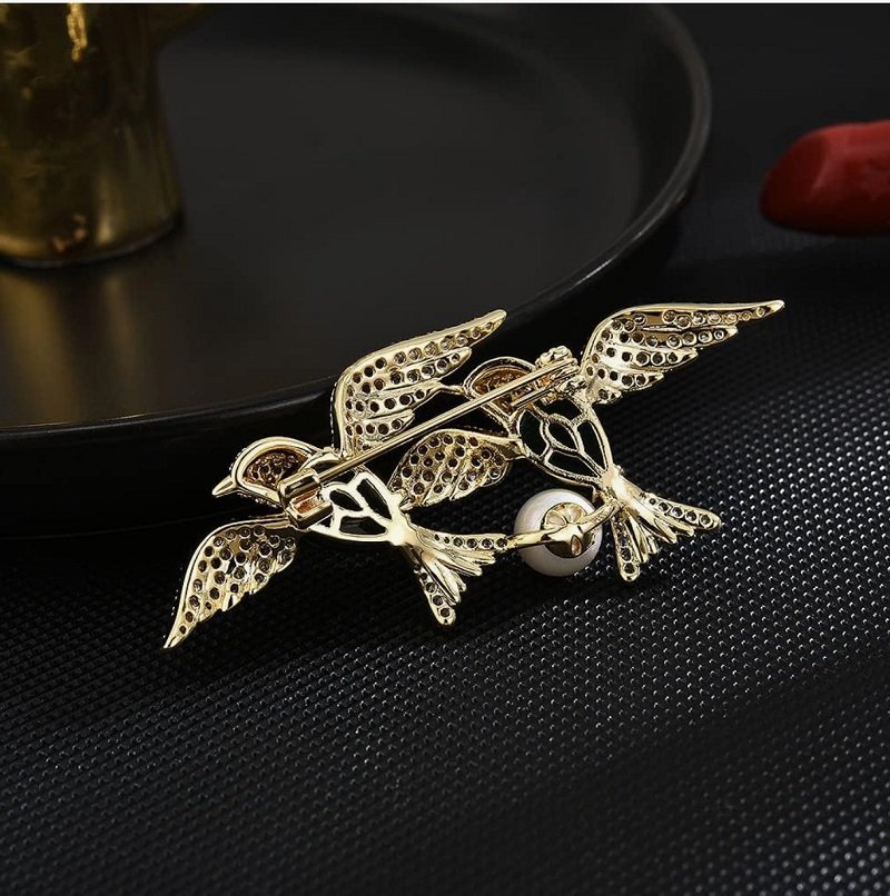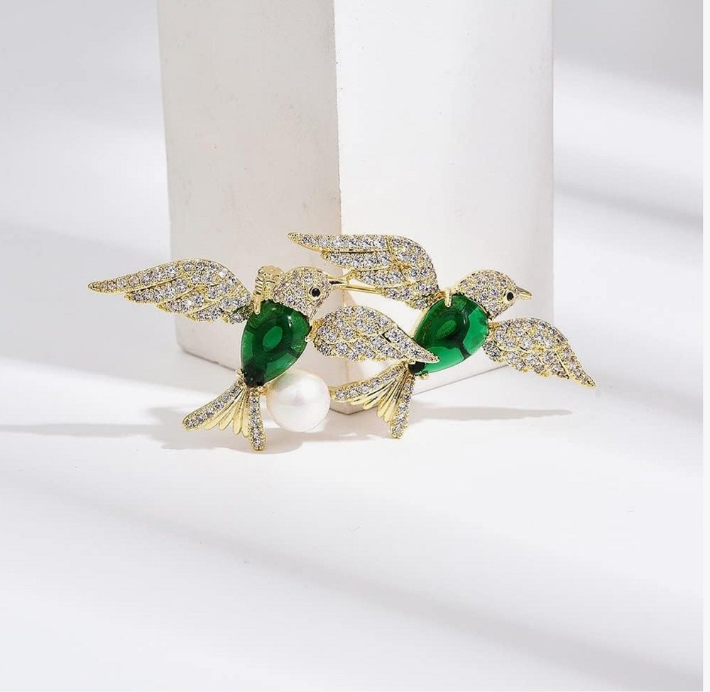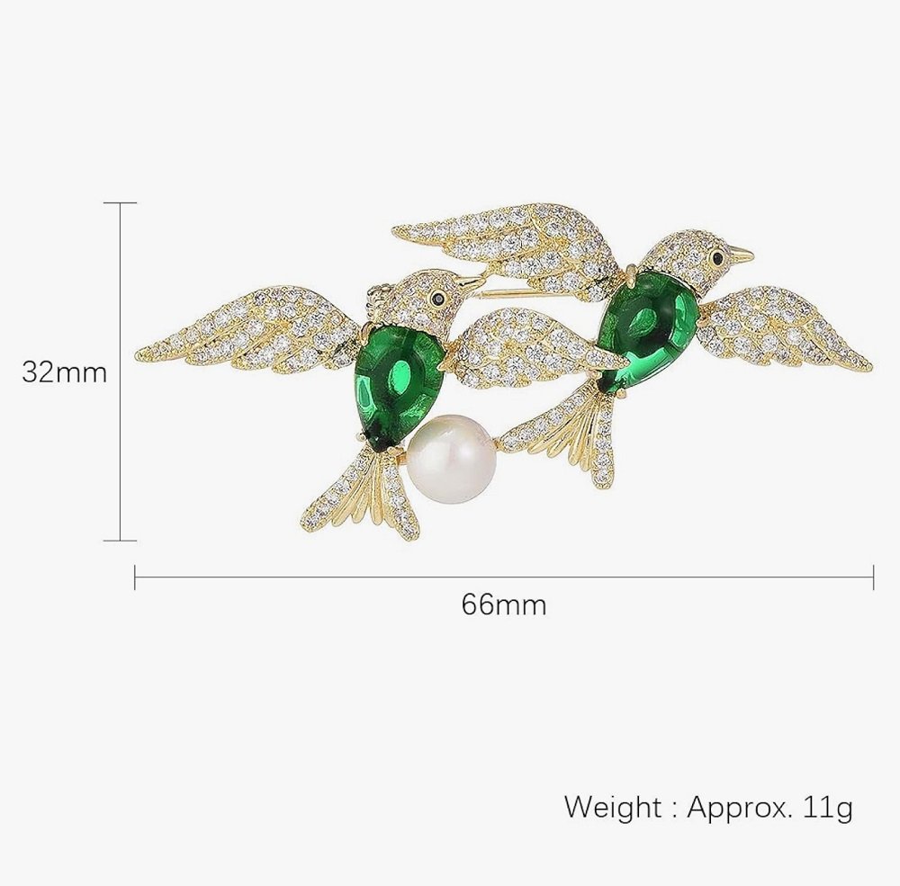 This Twin Emerald Bird Brooch features two elegant birds embellished with shimmering crystals and deep emerald-green enamel. A classic pearl adds timeless sophistication, making it ideal for both modern and traditional outfits. Perfect for collectors or as a meaningful symbolic gift representing harmony and love.