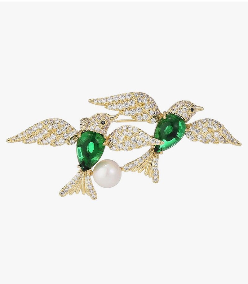 Twin Emerald Birds with Pearl Brooch